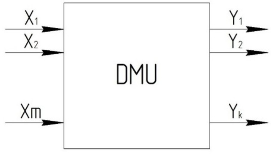 Оценка эффективности f одномерных производственных объектов сравнения, рассчитываемая на основе выражения (4), принимает исключительно положительные значения в интервале от 0 до 1. Метод DEA позволяет распространить соотношение (4) на случай многомерных объектов, что позволяет формировать сравнительные показатели эффективности DMU, характеризуемых вектором входных параметров X и вектором выходных параметров Y, путем сопоставления достигнутых результатов с затраченными на это ресурсами [21]. Рассмотрим произвольный многомерный объект сравнения, который имеет m входов и k выходов, как представлено на рис. 2.