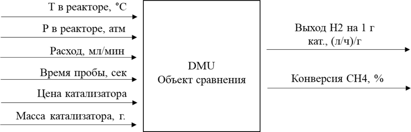 На основе представленных данных формулируется задача математического программирования, лежащая в основе метода DEA. Имеющиеся данные позволяют сформулировать задачу многофакторного анализа влияния технологических параметров процессов пиролиза метана на показатели эффективности процесса пиролиза метана как ЗМП. Входные и выходные параметры представлены на рис. 3.