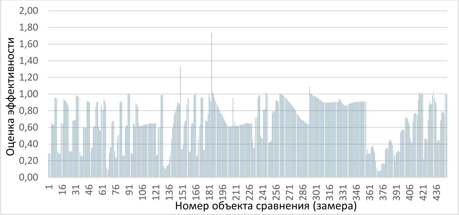 После того как блок многофакторного анализа СППР выполнил DEA-анализ, система представляет пользователю результаты в наглядном виде и сопровождает их интерпретацией. На рис. 4 представлены оценки эффективности, полученные на основе решения ЗМП (9), (10).