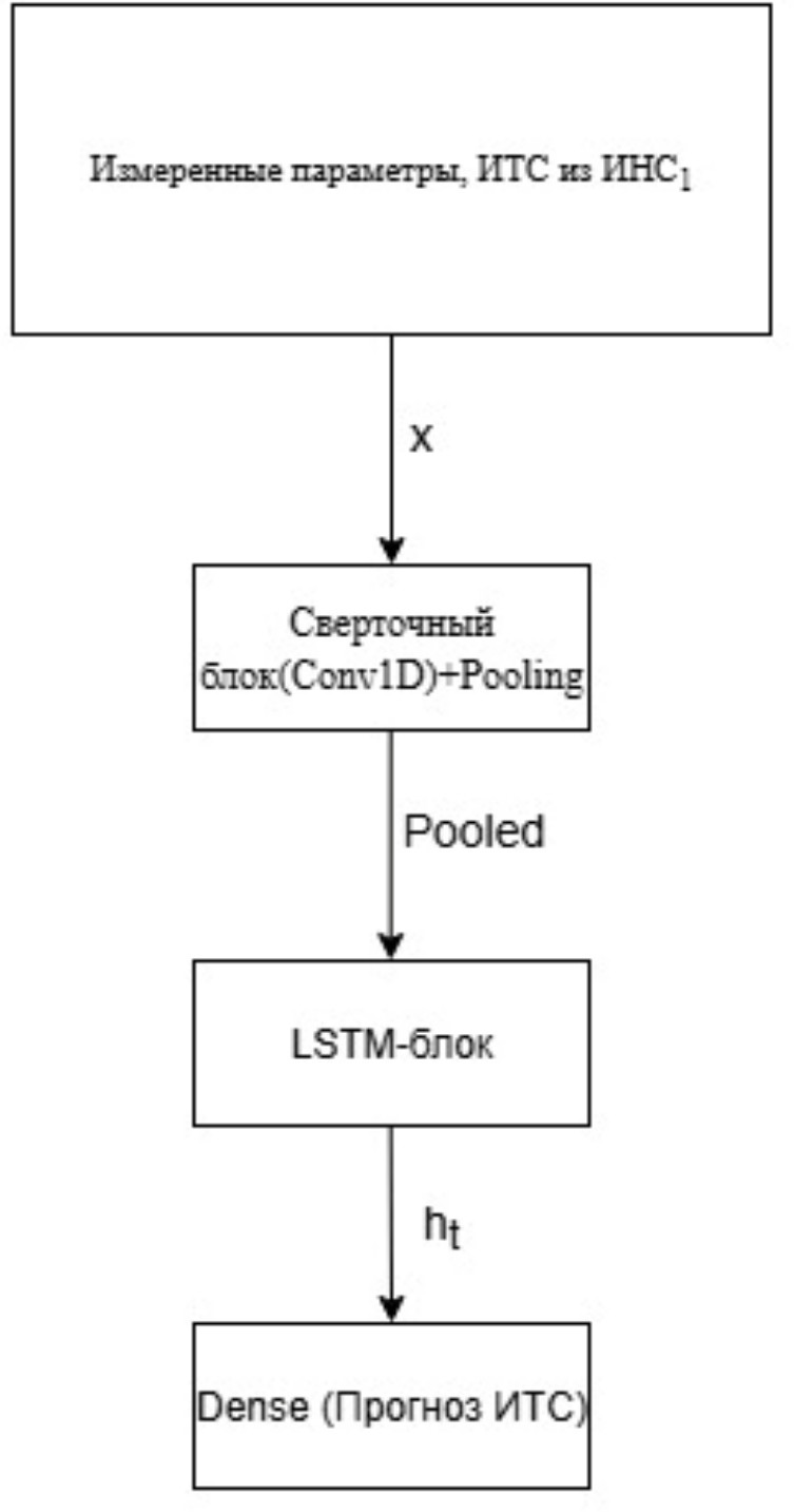Функциональная схема ИНС2 представлена на рис. 3. Рассмотрим подробнее логику работы ИНС2. Вторая нейронная сеть (ИНС₂) предназначена для прогностического анализа технического состояния паровой турбины Т-110/120-130. Она использует на вход расширенный набор признаков, включающий агрегированные результаты диагностики ИНС₁ (ИТС) и исходные эксплуатационные параметры. Архитектура ИНС₂ объединяет сверточный блок для локального выделения аномальных паттернов и рекуррентный LSTM-блок для учета долговременных зависимостей. При обучении ИНС₂ использовала среднеквадратичную ошибку между прогнозом и эталонными значениями. ИНС₂ включает в себя следующие функции и блоки: