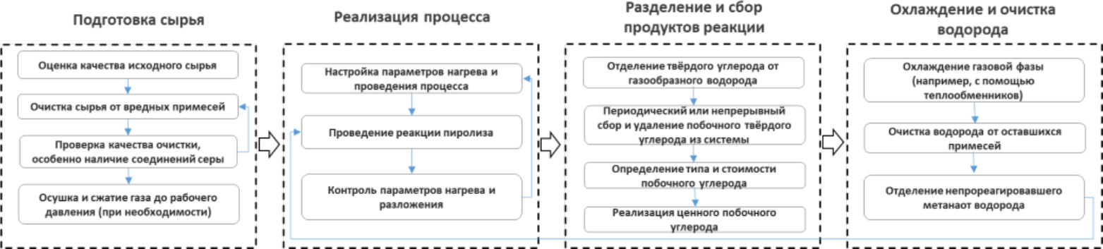 Из проведенного анализа следует, что пиролиз метана представляет собой не одну конкретную технологию, а совокупность технологических подходов к реализации процесса, основанных на общей химической реакции разложения метана (CH4) с образованием водорода (H2) и твердого углерода (C). При этом каждый из технологических подходов позволяет осуществить данную реакцию на технологических стадиях, принципиально отличающихся по физико-химическим основам протекающих процессов, условиям их проведения, конструктивным решениям, особенностям технической реализации и типам используемых энергоносителей.