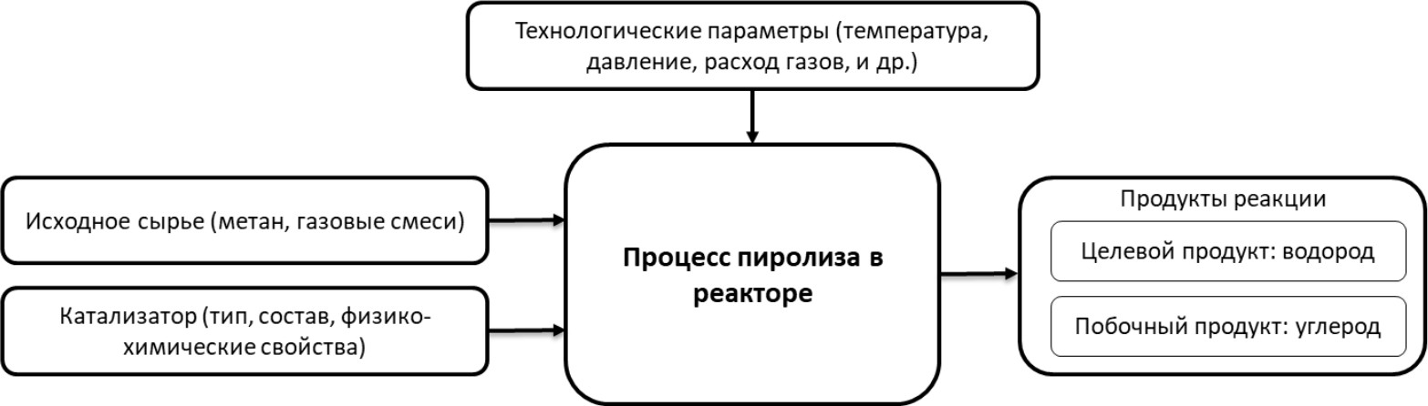 Каждый вариант реализации процесса характеризуется специфическим набором ключевых особенностей и показателей, отличающихся по физико-химическим механизмам, конструктивным схемам установок, условиям протекания процесса и получаемому углеродному продукту. Такое разнообразие делает невозможным использование упрощенных методов анализа и требует применения системного подхода, позволяющего комплексно учитывать взаимосвязи между подсистемами и факторами процесса.