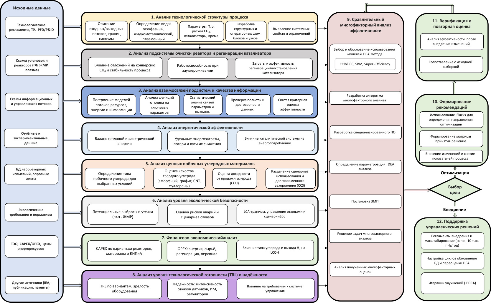 В качестве методологической основы для разработки методики системного анализа принят структурно-функциональный подход с иерархической декомпозицией и итеративной обратной связью. Он позволяет рассматривать процесс пиролиза как целостную систему, включающую взаимосвязанные подсистемы, с учетом взаимодействия с внешней средой и возможностью формирования входных и выходных параметров, используемых на последующих этапах DEA-анализа. Разработанная на основе этого подхода методика системного анализа технологии пиролиза метана включает 12 этапов, сгруппированных в три взаимосвязанных блока: 1) описание и анализ подсистем; 2) оценка технико-экономических и экологических характеристик; 3) интеграция данных и многофакторная DEA-оценка с последующей поддержкой управленческих решений.
