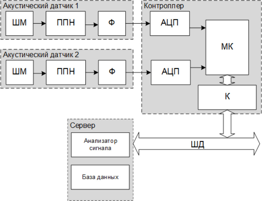 Рис. 1. Структурная схема экспериментальной установки: ШМ – широкополосный микрофон; ППН – предусилитель; Ф – фильтр; АЦП – аналогово-цифровой преобразователь; МК – микроконтроллер; К – коммутатор; ШД – шина данных