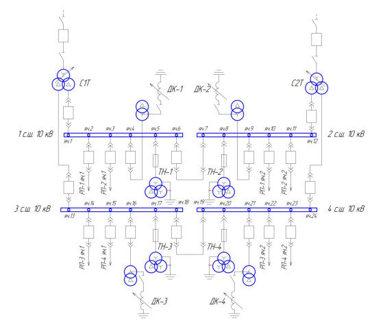 As can be seen in Figure 1, the power transformers (C1T, C2T) are made with a split low-voltage winding. This type of transformer is typical for urban electric networks, since it is necessary to limit short-circuit currents. Also, the advantage of schemes with several bus systems is greater maneuverability, which is important for medium-voltage distribution networks. After the voltage is transformed, the electricity is distributed over four sections of the tires. Each section of the tires corresponds to its own distribution points (RP), which receive power through two inputs. This scheme is given in a simplified form, in order to limit its clutter with other elements of the power grid, as well as to focus on the configuration of such schemes.