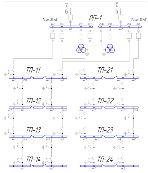 Also, the structure of the distribution network can be of a ring configuration. In this case, a chain of sequentially connected TP is powered from one section of the distribution point tires and the second end is connected to the other section of the RP tires. In normal mode, the ring has a gap on any TP in the chain. This gap is necessary to ensure the selectivity of the protections and for the separate operation of each part of the circuit. This scheme is used for consumers of the third category. Therefore, the main two-beam configuration has priority when choosing a scheme in the projected urban power supply systems.