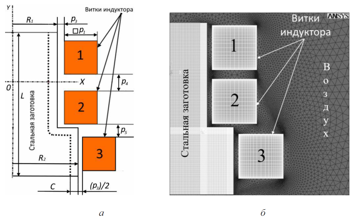 На рис. 1а показаны следующие конструктивные параметры, влияние которых на температурное поле исследуется в работе: p1 (размер квадратного сечения витков), p3 (расстояние, характеризующее положение витков относительно заготовки, – воздушный зазор), p4 (расстояние между витками 1 и 2), p5 (расстояние между витками 2 и 3). Кроме того, исследовалось влияние режимных параметров процесса нагрева: p2 (силы тока на витках 1 и 3) и p6 (силы тока на витке 2). Исходные данные для моделирования представлены в табл. 1.