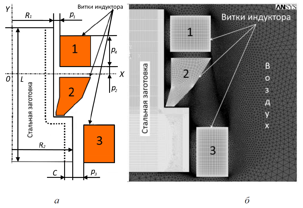 Рис. 3. Двумерная осесимметричная модель системы «индукционный нагреватель – стальная заготовка» с усложненной геометрией витка 2: а – общий вид с обозначением конструктивных параметров; б – наложенная конечно-элементная сетка в ППП ANSYS