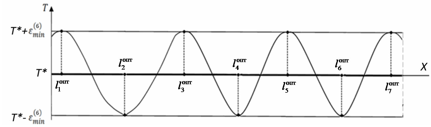 Согласно альтернансному методу, основное свойство распределения состоит в том, что число К точек в сечениях обрабатываемой заготовки вдоль границы закаливаемого слоя с координатой X, в которых достигаются предельно достижимые абсолютные отклонения конечной температуры от требуемой T*, равные ε, всегда оказываются не меньше числа N искомых оптимизируемых параметров процесса, причем эти отклонения являются знакочередующимися в точках ,, т. е. обладают альтернансным свойством [9].
