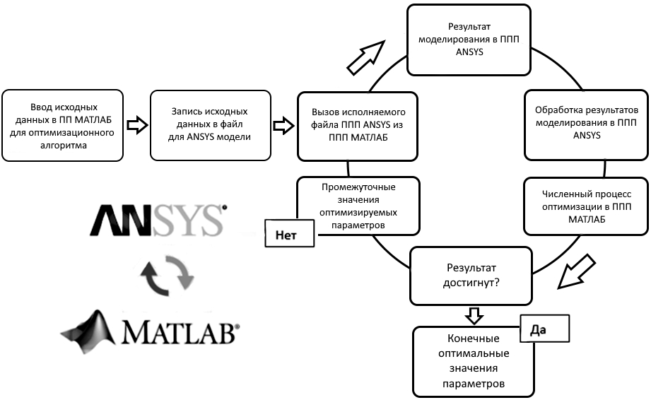 Следующим шагом производится запуск расчета оптимизационной процедуры, которая работает следующим образом (рис. 6). В ПП МАТЛАБ алгоритм создает файлы и прописывает в них значения исходных параметров. Далее ANSYS считывает эти файлы, строит и рассчитывает модель. Формируется температурное распределение. Затем в МАТЛАБ передается этот массив данных из ППП ANSYS, производится программный анализ и численное дифференцирование температурного распределения. Решается система из 14 уравнений по альтернансному методу и производится анализ результатов оптимизируещей функцией LSQnonlil.