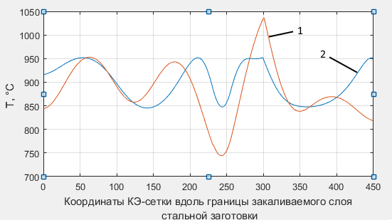 Рис. 7. Результирующее температурное распределение по границе закаливаемого слоя заготовки: 1 – для индуктора с квадратной формой витков; 2 – после оптимизации параметров индуктора со сложной с формой витка № 2