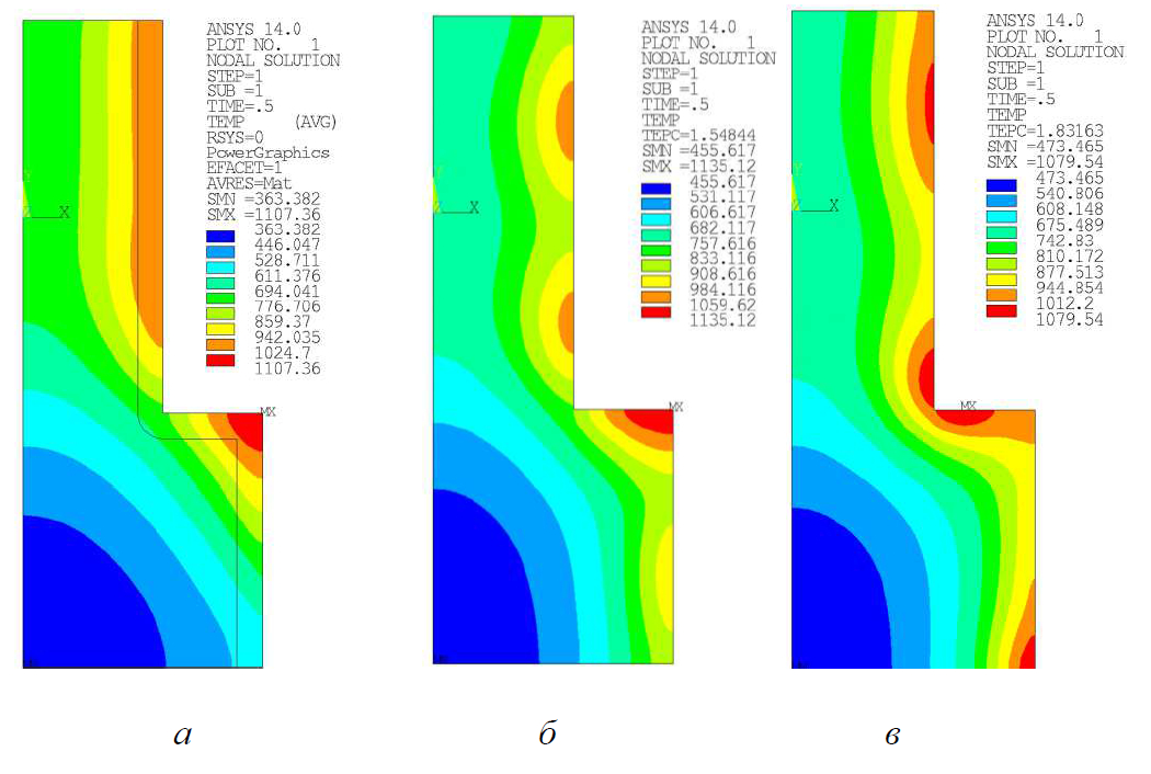 Рис. 8. Результирующее распределение температуры в продольном сечении заготовки: а – для параметров индуктора, представленных в табл. 2 (строка 1); б – для параметров индуктора, представленных в табл. 2 (строка 2); в – для оптимальных параметров индуктора