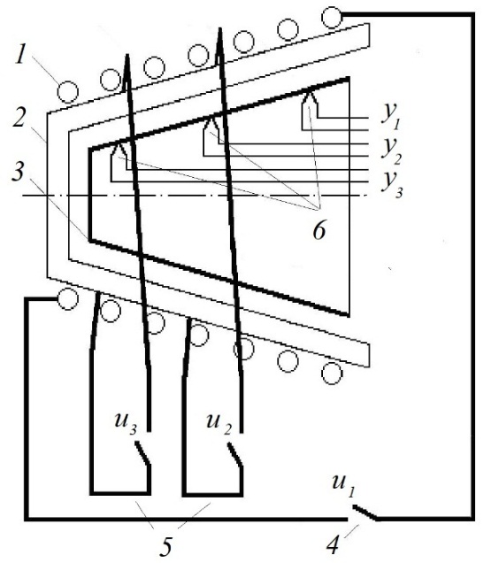 В работе рассмотрена задача многокритериального нечетко-оптимального позиционного управления объектом технологической теплофизики с распределенными параметрами на примере установки индукционного нагрева. Установка индукционного нагрева парамагнитных тонкостенных оболочек до заданных кондиций с последующей стабилизацией температуры на этом уровне представлена на рис. 1. Изделие помещается в индукционный нагреватель, состоящий из индуктора, питающегося от источника переменного тока, и теплоизоляции. Температура нагрева контролируется термопарами в трех точках, разнесенных по длине нагреваемого тела (выходные сигналы ). Температурное поле на завершающей стадии процесса должно достаточно продолжительное время быть равномерным на уровне , т. е. отклоняться от заданной температуры не более чем на . Это требование обеспечивают три управляющих воздействия: . Основной канал управления – мощность питающего индуктор источника . Этот канал позволяет воздействовать на среднюю температуру изделия, но не в состоянии существенно изменять закон распределения температуры по длине изделия. Для обеспечения требуемой равномерности нагрева индуктор снабжен дополнительными витками как устройствами выравнивания температуры по длине изделия. В разомкнутом состоянии () витки не оказывают влияния на процесс нагрева. При замыкании витка () в нем наводится противо-ЭДС. Это вызывает локальное снижение мощности нагрева в зоне размещения витка, что способствует выравниванию температуры в нагреваемом изделии.