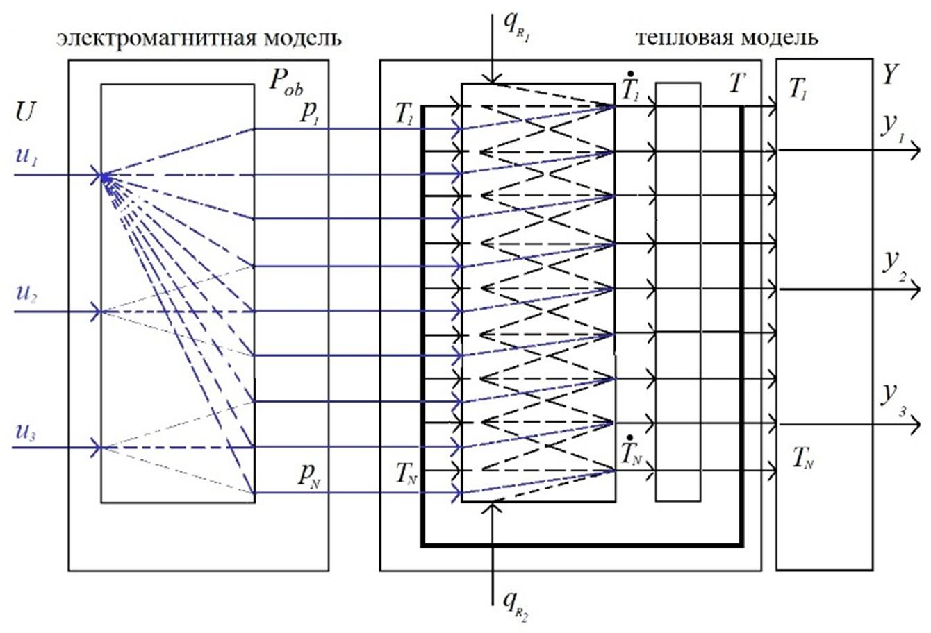 В выражении (9) , полное сопротивление каждого элемента , где – угловая частота питающего напряжения, . Элементы диагональной матрицы равны , где – активное сопротивление -го соленоида. Соленоиды с номерами и (устройства выравнивания температуры) могут в процессе нагрева быть замкнутыми, если , или размыкаться при , , и тогда , . Элементы матрицы равны , где – индуктивность -го соленоида, – взаимная индуктивность -го и -го соленоидов. Решение системы (9) определяет значение токов в индукторе, в устройствах выравнивания температуры по длине изделия и в соленоидах, которыми представлены составляющие электромагнитную систему тела. Токи соленоидов используются далее для определения мощности внутренних теплоисточников в (8), , . Системные связи процесса индукционного нагрева как объекта управления показаны на рис. 2.