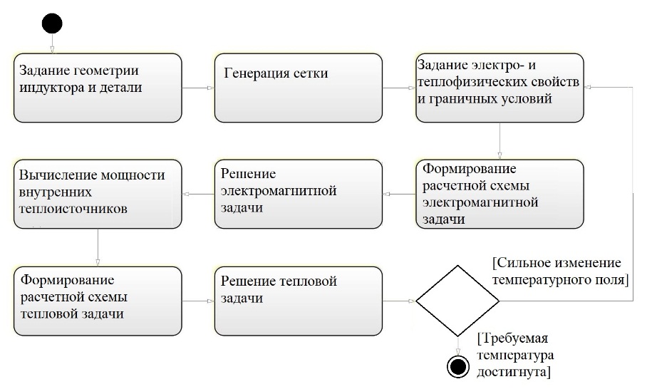 Для численного моделирования электромагнитных процессов индукционного нагрева автором были разработаны специальные подпрограммы [20], составляющие в совокупности с подпрограммами расчета тепловых процессов цифровую модель индукционного нагрева парамагнитных тонкостенных оболочек (рис. 3). Модель реализована в пакете MATLAB и использовалась для нечеткой оптимизации процесса нагрева. Малое время счета на доступных вычислительных ресурсах является следствием использования упрощений, сведения задачи с распределенными параметрами к задаче с сосредоточенными.