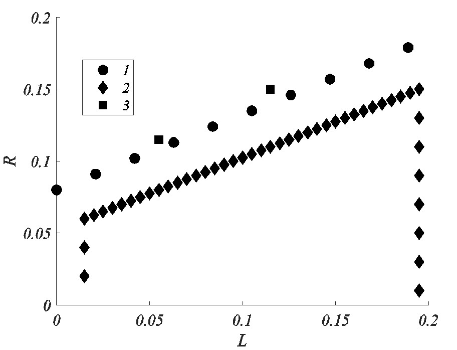 Рис. 4. Геометрические параметры установки индукционного нагрева: 1 – индуктор; 2 – нагреваемое изделие; 3 – устройства выравнивания температуры по длине изделия