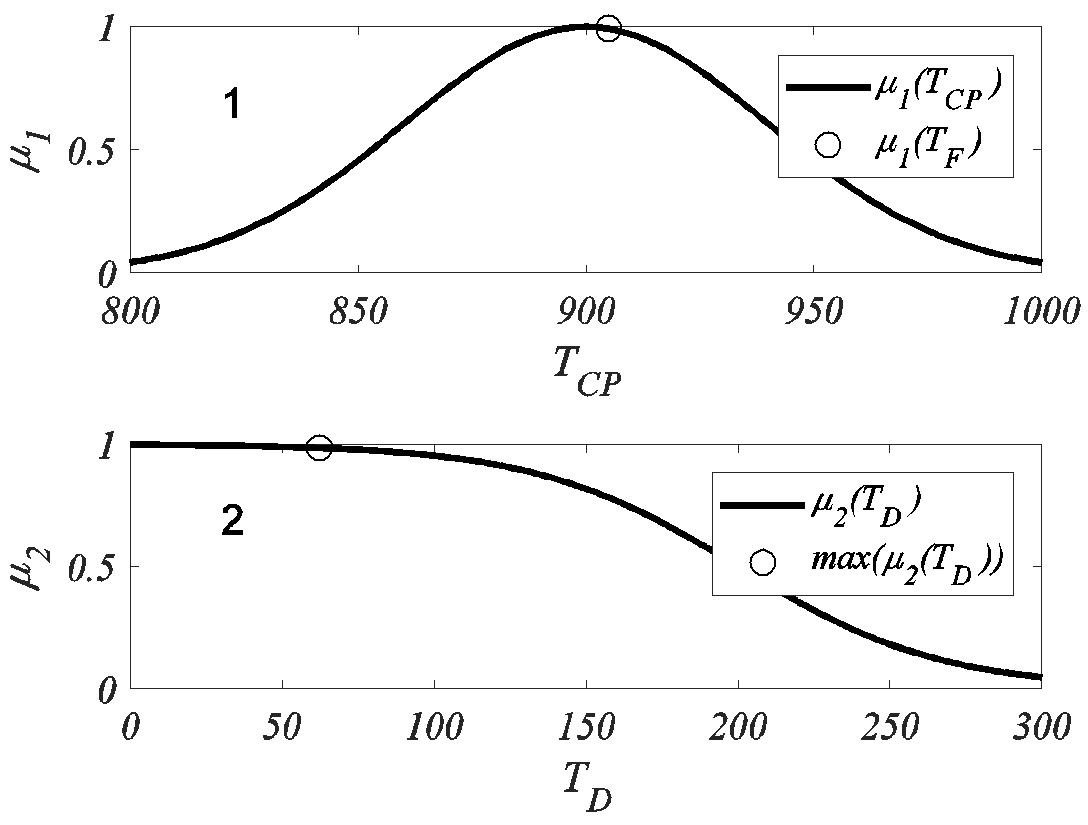Функции принадлежности представляют степени выполнения сформулированных целей и заданы аналитически: Требование обеспечить нагрев объекта управления до уровня представлено функцией принадлежности (1 на рис. 6). Поскольку величина максимального перепада по длине в течение этапа нагрева и этапа стабилизации температуры не должна превышать 30 °С, степень выполнения этого дополнительного условия представлена функцией принадлежности (2 на рис. 6).
