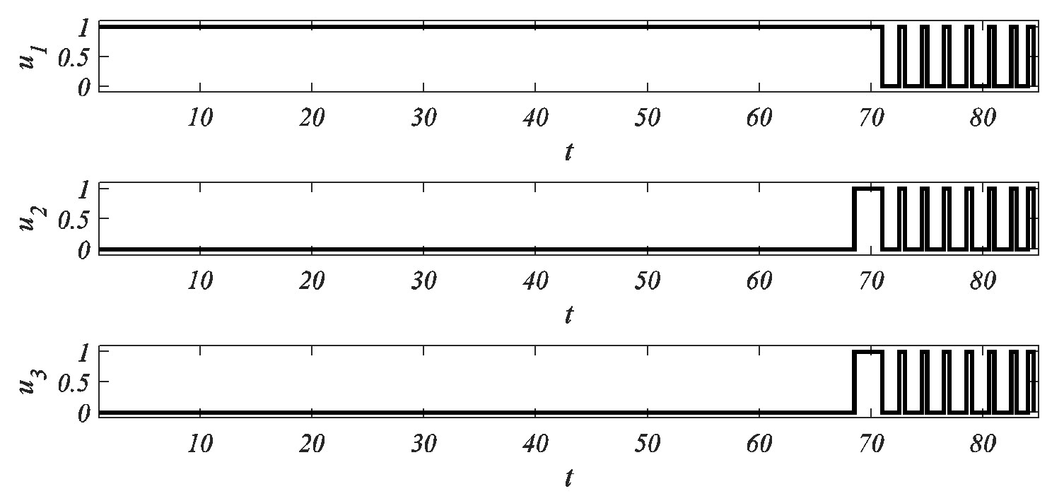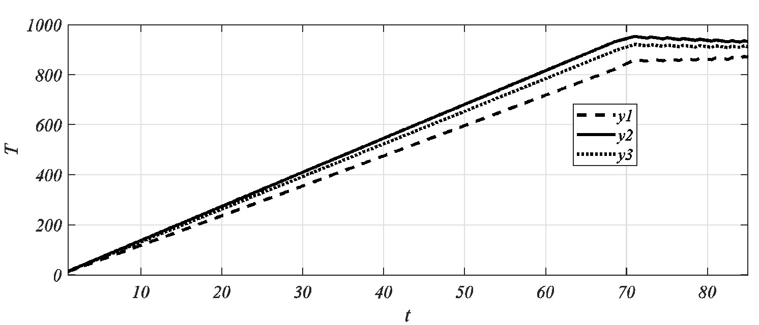 Использование позиционного способа позволяет скорректировать управление в случаях отклонения траектории процесса от желаемой вследствие неточности модели или воздействия возмущающих факторов. Однако вычисление сигнала управления происходит в тактовые моменты времени не мгновенно, возникает определенное временное запаздывание. При значительной сложности вычислений этот факт должен быть принят во внимание. Существенно сократить время вычислений можно, если использовать сигнал управления мощностью питающего индуктор источника в виде релейной функции, как это имеет место в строго оптимальной по быстродействию постановке [18], тогда .