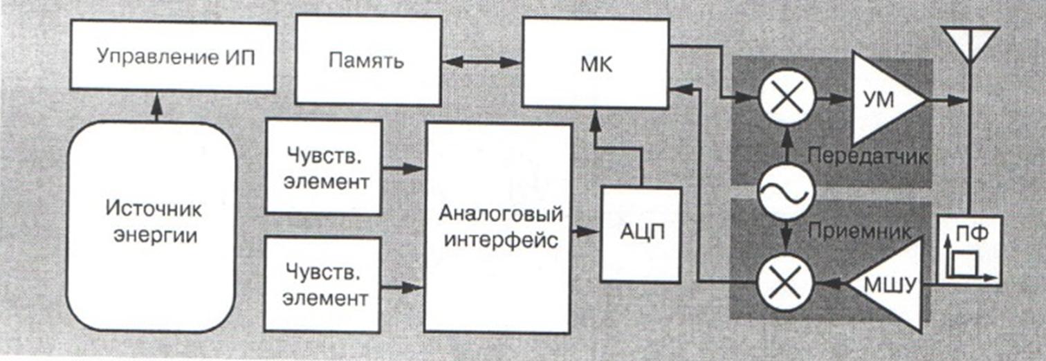 В рассмотренных выше блоках датчики являются внешними устройствами, подключаемыми через соответствующие интерфейсы. Однако в последнее время наметилась тенденция к интеграции чувствительных элементов первичных преобразователей непосредственно в модуль управления и приемопередачи, как это показано на рис. 2.