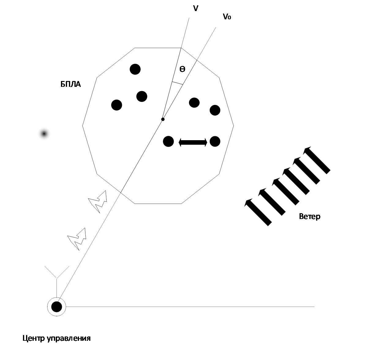 Рой таких БПЛА управляется из общего Центра управления и должен иметь направление и скорость перемещения центра роя, заданные вектором . Под воздействием ветра и иных внешних факторов перемещение центра роя отклоняется от заданного направления на угол и происходит в направлении вектора . Изучая статистику перемещения центра роя, можно построить экстраполяцционную модель вектора этого перемещения и передать каждому БПЛА упреждающий сигнал управления. Однако для качественного управления необходимо иметь также предметную модель самого БПЛА как объекта управления. Именно такая модель позволит управлять быстро протекающими процессами и исключить возможность столкновения соседних БПЛА. Следует отметить, что для уменьшения запаздываний управляющих сигналов контуры автоматического управления, исключающие возможность столкновения БПЛА, целесообразно замыкать непосредственно между самими БПЛА, исключив из них Центр управления.