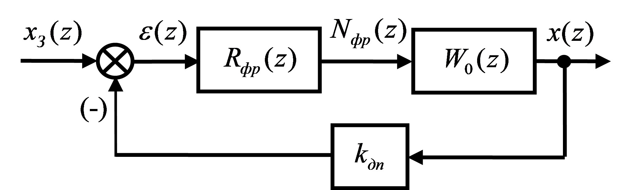 На структурной схеме приняты следующие обозначения: – дискретная передаточная функция регулятора, обеспечивающего финитное управление; – дискретная передаточная функция непрерывной части системы (силового преобразователя, синхронного двигателя и исполнительного механизма) с учетом экстраполятора нулевого порядка; – коэффициент передачи датчика положения; – изображение задающего воздействия; – изображение перемещения ротора; и – изображения сигналов на входе и выходе финитного регулятора; на ; – комплексная переменная; – период дискретизации по времени.