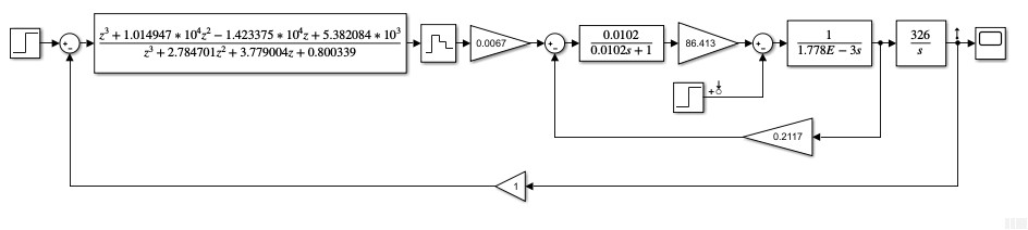 Рис. 3. Расчетная модель следящего электропривода в виде композиции дискретного финитного регулятора, экстраполятора нулевого порядка и синхронного двигателя с исполнительным механизмом, охваченных обратной связью по положению
