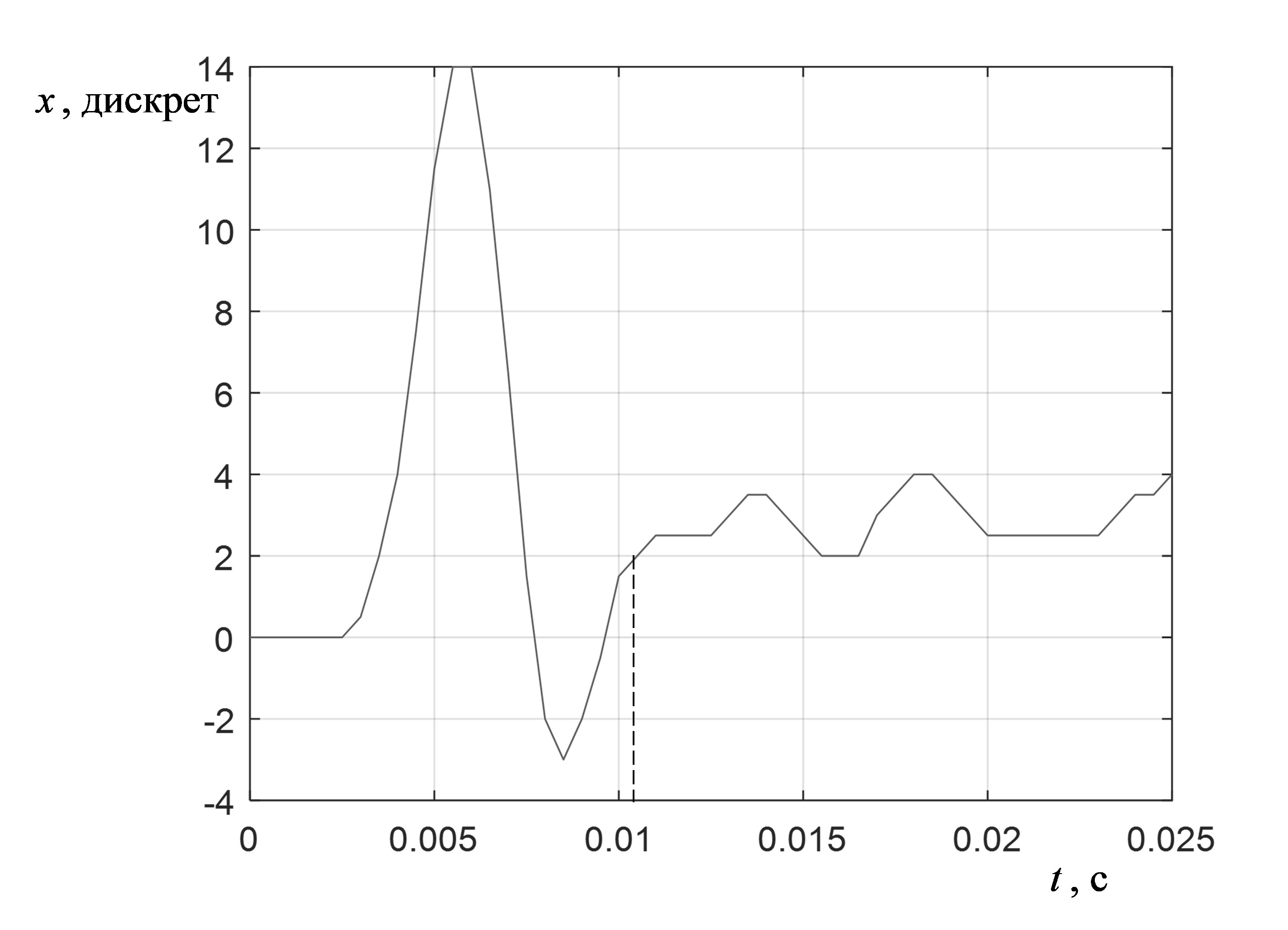 В расчетной модели выделена цепь статора синхронного двигателя, которая представлена апериодическим звеном с постоянной времени 0,0102 с, коэффициент передачи двигателя по моменту, равный 86,413 Нм/АГн, приведенный момент инерции ротора 0,001788 кгм2 и коэффициент передачи исполнительного механизма 326 дискрет/рад. Такая расчетная модель позволяет также построить переходный процесс по отношению к возмущающему воздействию – моменту нагрузки двигателя (рис. 4). Анализ графика показывает, что переходный процесс по возмущению также заканчивается за 6 тактов периода дискретизации, при этом динамический провал составляет порядка 2,7 дискрет датчика положения. Отрицательным результатом следует считать появление статической ошибки позиционирования, равной 1,1 дискрет датчика при набросе момента нагрузки в 1 Нм (21 % от номинального значения).