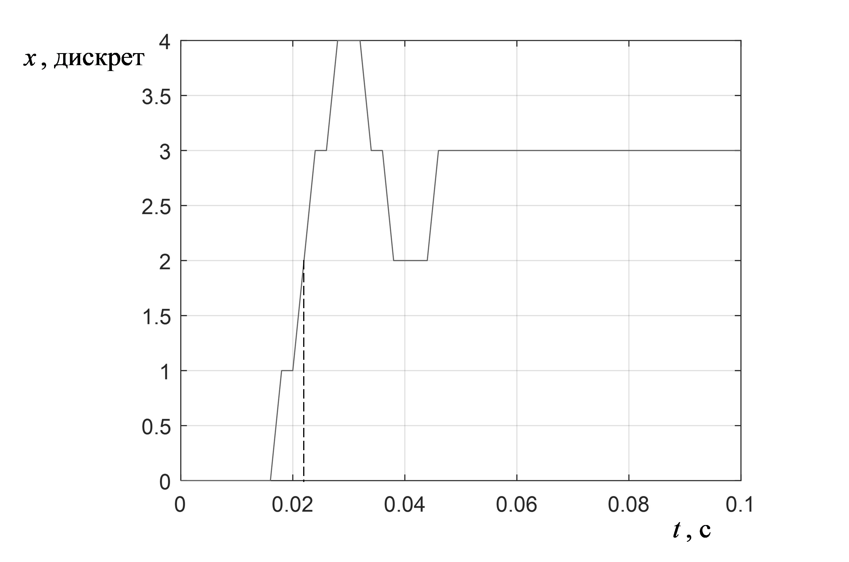 Рис. 6. График перемещения исполнительного механизма на 3 дискреты с учетом ограничений тока и напряжения силового преобразователя при с