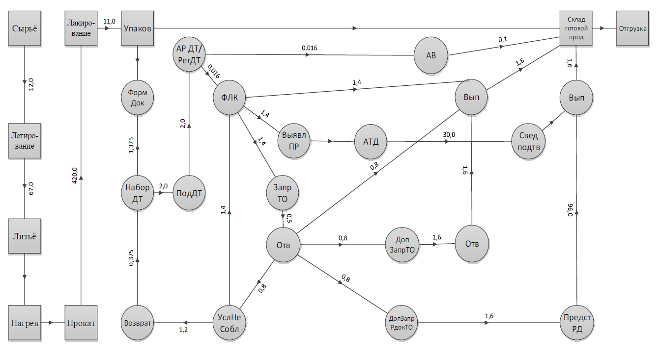 Последовательность совершения технологических операций, связанных с производством крышечной ленты, и вариантов таможенных операций, совершаемых при таможенном декларировании и таможенном контроле экспортируемой крышечной ленты, показана на графе (рис. 9). Числовыми значениями весов ребер графа обозначена длительность совершения операций в часах. Вершины графа в форме квадрата означают технологические этапы производственного процесса по изготовлению крышечной ленты, а в форме круга – таможенные операции, связанные с декларированием на экспорт крышечной ленты.