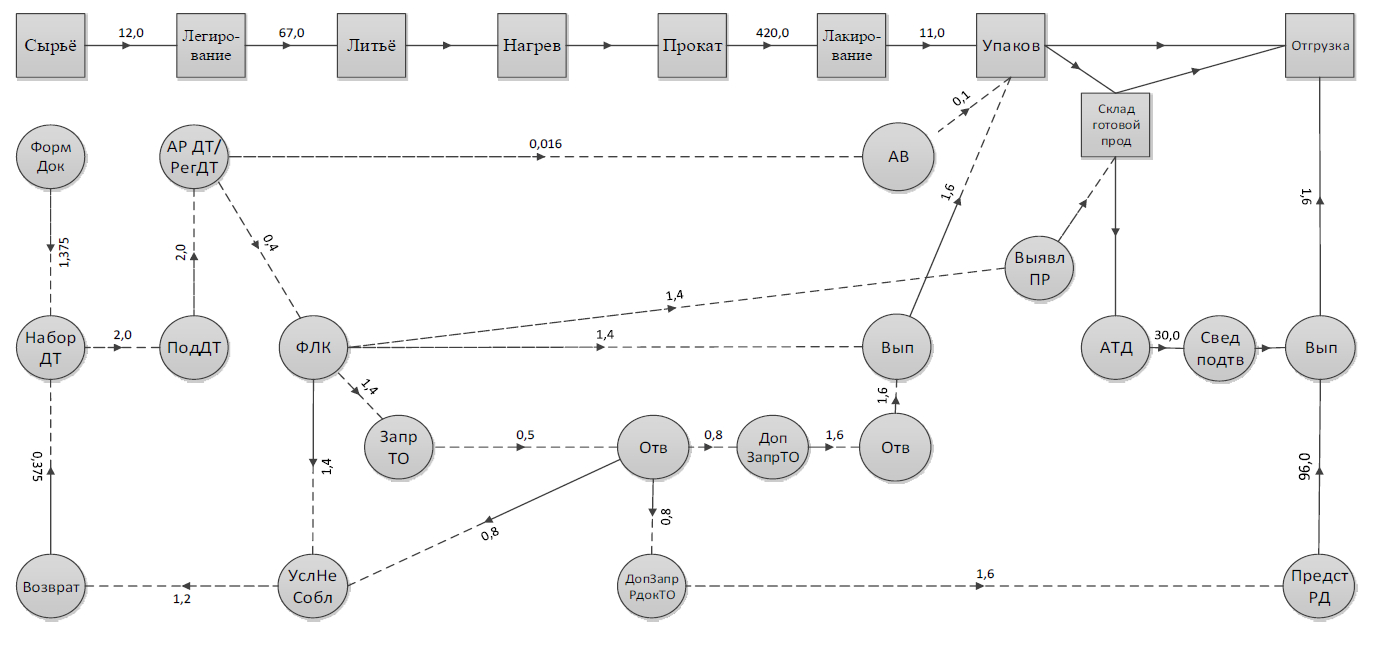 На графе (рис. 12) схематично показана синхронизация времени совершения таможенных операций со временем производственного цикла. Ребра графа, показывающие синхронизируемые с технологическим процессом таможенные операции, выделены пунктирными линиями. Исключения составляют операции, связанные с предъявлением таможенным органам отдельных партий экспортируемой продукции для проведения таможенного досмотра (ребра графа, обозначенные сплошными линиями).