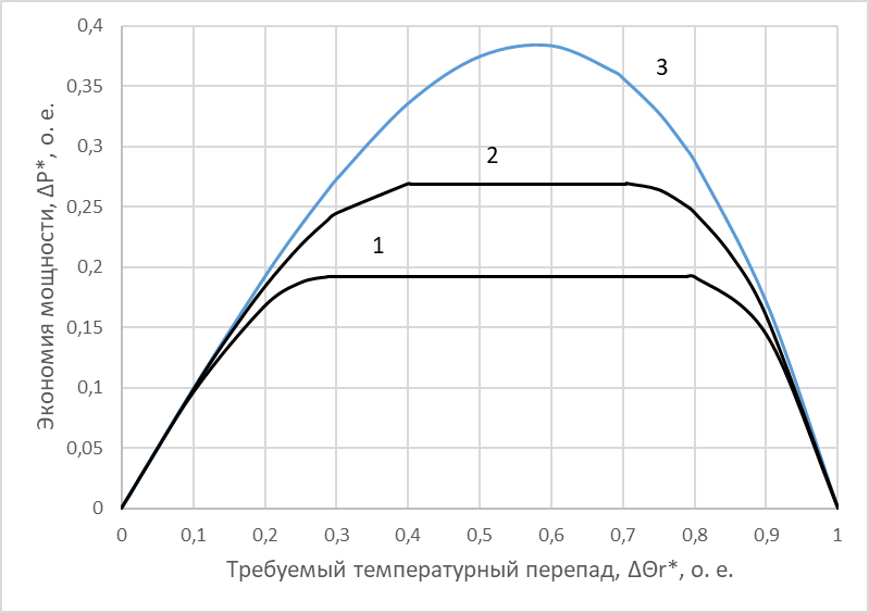 Экономия электроэнергии в общем случае находится интегрированием по времени экономии мощности, которая при частотном и комбинированном управлении, в отличие от дискретного, нелинейно зависит от относительного требуемого температурного перепада .