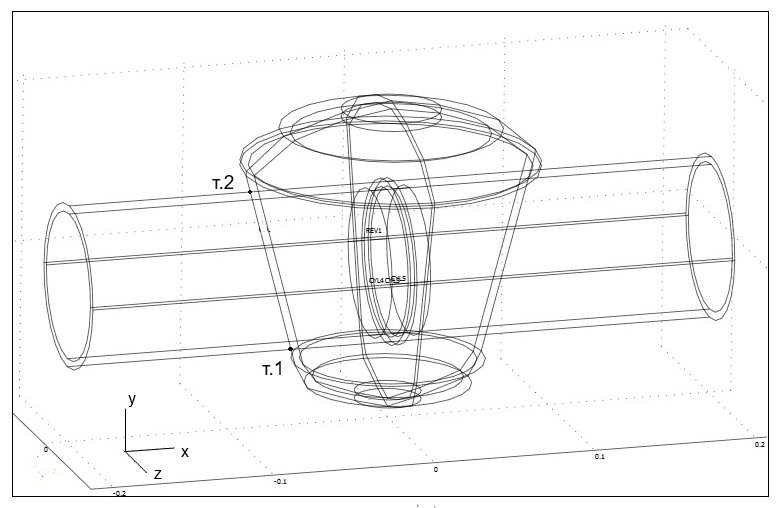 На рис. 1 представлена модель конструкции задвижки с жестким клином, корпус которой имеет форму конической оболочки, ограниченной с нижней и верхней сторон фрагментами сферических оболочек. Для упрощения моделирования некоторые внутренние детали не представлены. В целях снижения времени расчета размеры задвижки приняты уменьшенными. Диаметр горизонтальной цилиндрической части модели равен 0,1 м.