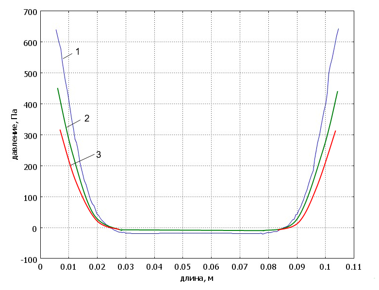 Рис. 3. Диаграммы давления на поперечной линии клина x = 0, y = 0, z = [-0,5; 0,5] м при охлаждении с 20 °С до температуры среды: 1 – -20 °С; 2 – -10 °С; 3 – 0 °С