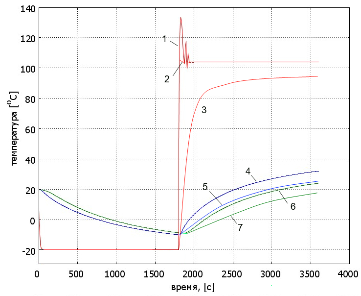 Рис. 6. Диаграммы температуры в точках задвижки при разной мощности тепловыделения: 1 – на поверхности при мощности 4900 Вт; 2 – на поверхности при мощности 2100 Вт; 3 – на поверхности при мощности 136 Вт; 4 – на нижней поверхности клина при мощности 4900 и 2100 Вт; 5 – на верхней поверхности клина при мощности 4900 и 2100 Вт; 6 – на нижней поверхности клина при мощности 136 Вт; 7 – на верхней поверхности клина при мощности 136 Вт