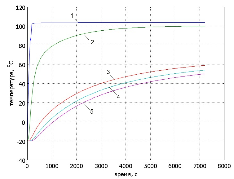 Рис. 5. Временные диаграммы температуры при нагреве задвижки в точках х = 0, z = 0: 1 – у = -0,086 м; 2 – у = -0,08 м; 3 – у = -0,05 м; 4 – у = 0; 5 – у = 0,05 м