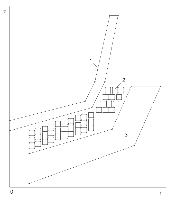 В качестве геометрической модели принята конструкция, состоящая из горизонтальных участков цилиндрической оболочки (пустотелой трубы), между которыми располагается клин, и вертикальной конической оболочки. Вертикальная часть корпуса сверху и снизу ограничена полусферическими оболочками.