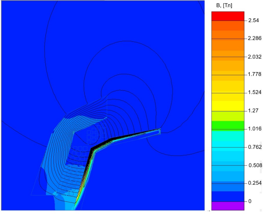 Рис. 8. Распределение индукции в системе «индуктор – корпус – магнитопровод» при токе 200 А и магнитопроводе из стали