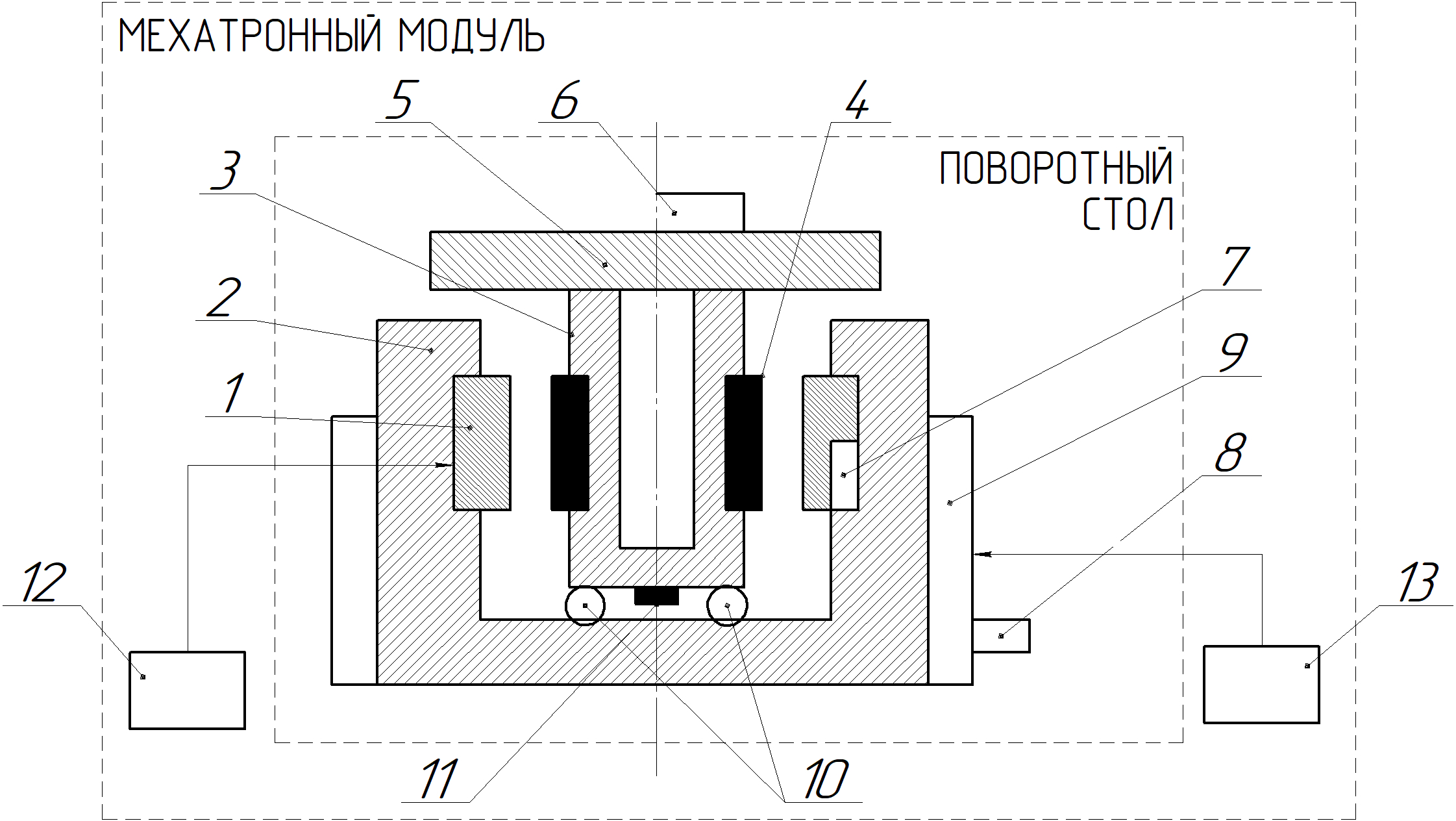 Конструкция поворотного стола на основе синергетического объединения в одном модуле электродвигателя, механического устройства в виде планшайбы и информационного устройства в виде датчиков, контролирующих параметры движения, создает мехатронный модуль движения, который является объектом системы автоматического управления. Предлагаемый модуль может быть создан на основе синхронного электродвигателя с постоянными магнитами на роторе [7, 8], например 1FW6.