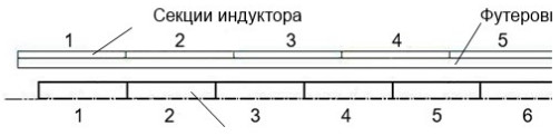 Схема расположения цилиндрических заготовок в многосекционном индукционном нагревателе методического нагрева представлена на рис. 1. Нагреватель состоит из шести секций. Заготовки, находящиеся в нагревателе, перемещаются дискретно. Между индуктором и заготовкой предусмотрена тепловая изоляция.