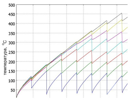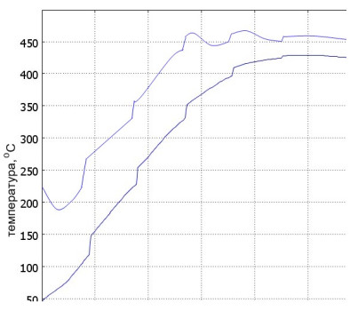 Альтернативным вариантом пуска является работа всех секций при задании одинаковых токов во всех секциях. Более ограниченные возможности этого режима позволили получить заданное распределение температуры при значении интервала нагрева, равном 1400 секунд, что снижает производительность установки. При меньшем значении интервала нагрева в момент выхода заготовки из индуктора температуры на поверхности и на осевой линии отличаются на 75–105 градусов. Даже учитывая время транспортировки к прессу, такой перепад снизить до приемлемого значения сложно.