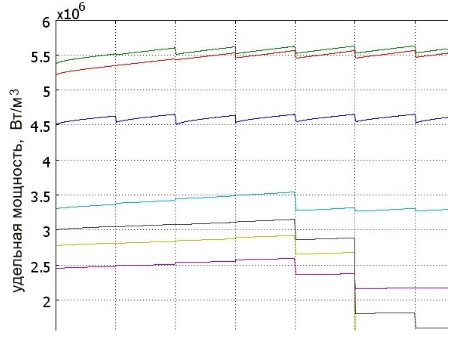 Рис. 6. Временные диаграммы удельной мощности в средней по длине заготовки координате с интервалом выдачи 1400 с