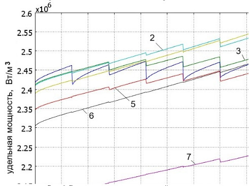 Для темпа выдачи 1400 с построены временные диаграммы удельной мощности в средней части каждой находящейся в нагревателе заготовки (рис. 6). Рассчитанные и корректируемые в процессе пуска значения токов секций обеспечивают более гладкий вид диаграммы мощности в заготовках при пуске и последующем установившемся режиме (квазиустановившемся, так как циклически изменяются температура и параметры). Форма диаграмм для каждой секции иллюстрирует изменение удельной мощности. Отличие от диаграммы температуры состоит в том, что выход на квазиустановившийся режим для каждой заготовки зависит от расстояния до выхода из индуктора. В заготовке с номером 1, находящейся на выходе, переходный процесс самый растянутый во времени. После выхода на квазиустановившийся режим колебания мощности составляют около 2 %. В то же время с момента включения до выхода на установившийся режим значения мощности в разных заготовках изменяются в пределах 7 %.