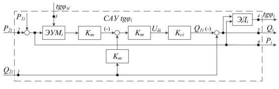 Структурная схема системы управления КРМ tgφi с алгоритмом, сформированным в функции активной и реактивной мощности электроприемников, представлена на рис. 3. На этой схеме ЭУМi и ЭДi – элементы умножения и деления соответственно.