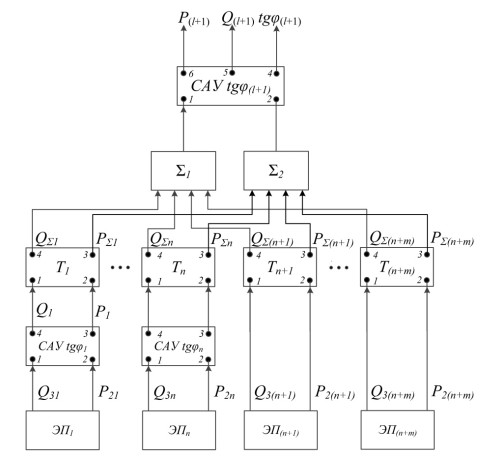 Обозначения на схеме: – типовые САУ, структурные схемы которых показаны на рис. 3; , – элементы суммирования входных переменных; САУ – система автоматического управления коэффициентом реактивной мощности на стороне низшего напряжения трансформаторов ГПП; – число цеховых трансформаторов с конденсаторными установками и без них.
