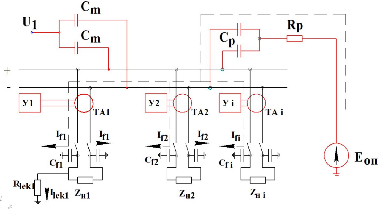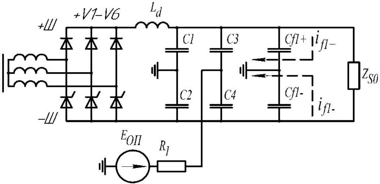 Емкости С1, С2 (рис. 2) отражают наличие блокировочных емкостей на полюсах выпрямителя и собственную емкость полюсов щита постоянного тока относительно земли. Емкости C3, C4 представляют емкость инжекционной развилки [10, 11] системы контроля изоляции на землю. Емкости Cf+ и Cf– отражают емкости контролируемого фидера. В общем случае они не равны между собой.