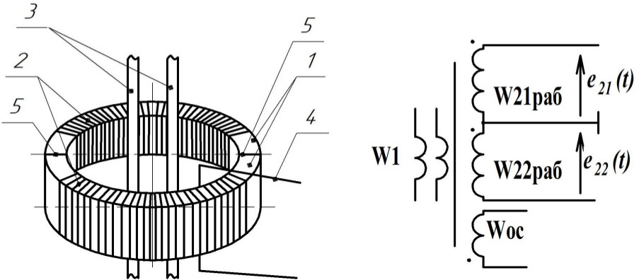 Конструктивно датчик тока представляет собой два ферритовых полукольца, на которые намотаны сфазированные между собой рабочие полуобмотки W21раб и W22раб (рис. 3), формирующие ЭДС e21(t) и e22(t).