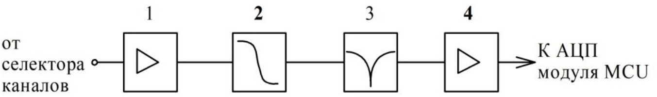 Рис. 4. Структурная схема канала тока: 1 – входной усилитель; 2 – фильтр низких частот; 3 – режекторный фильтр; 4 – выходной буферный каскад