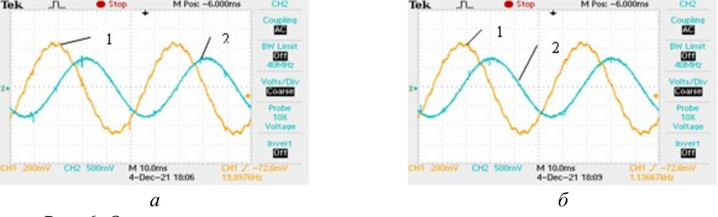 Рис. 6. Осциллограммы выходов аналоговых каналов системы контроля изоляции при воздействии источника опорного напряжения и работе трехфазного выпрямителя: а – при отсутствии утечки в зоне контролируемого фидера; б – при сопротивлении цепи 20 кОм в зоне контролируемого фидера, где 1 – выход канала IF, 2 – выход канала U