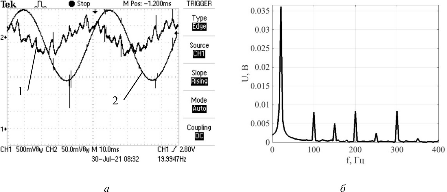 Осциллограммы, представленные на рис. 6, получены при протекании выпрямленного тока с выхода трехфазного выпрямителя, имеющего фазное напряжение на входе 6 В, и тока от источника опорного напряжения. Согласно расчетам величина ЭДС с частотой 300 Гц на стороне постоянного тока будет составлять 0.78 В реальном ЩПТ, для достижения средневыпрямленного значения 220 В необходимо 94 В фазного напряжения. При этом в спектре выпрямленного напряжения будет присутствовать составляющая 12.7 В с частотой 300 Гц.