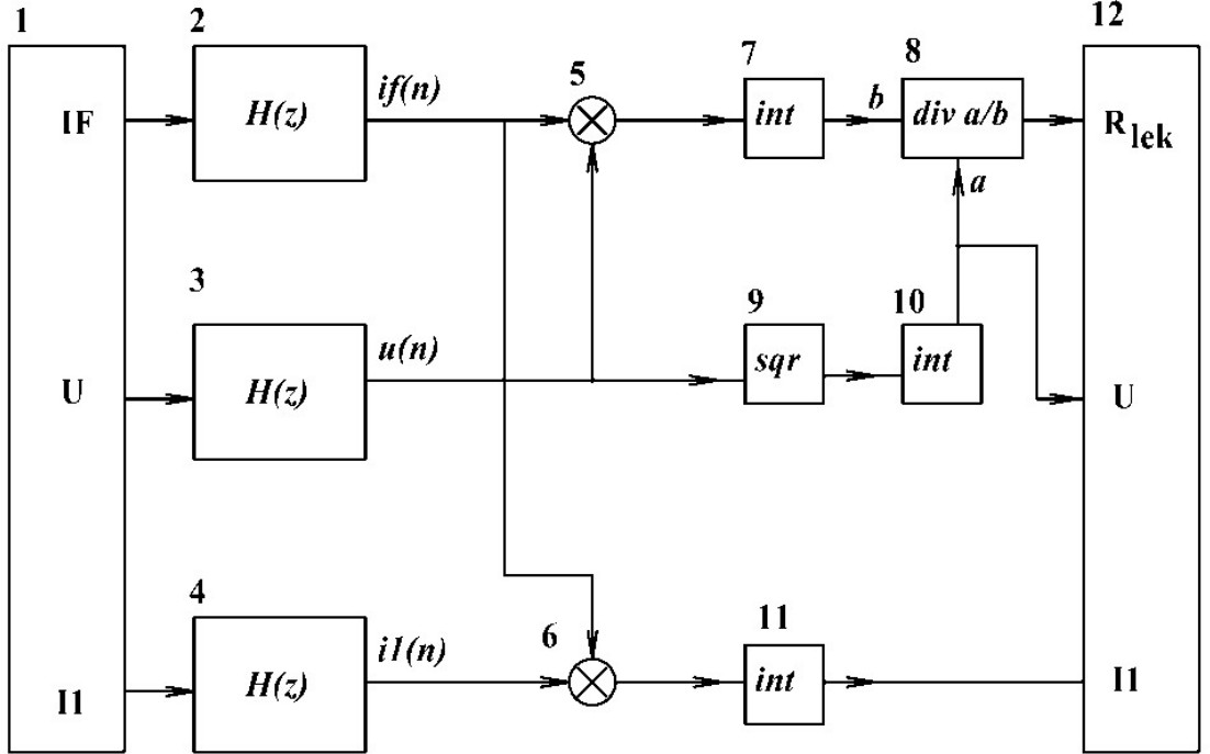 Сигнал с выхода цифрового фильтра 3 возводится в квадрат звеном 9 и поступает на интегратор 10, на выходе которого по истечении времени наблюдения формируется квадрат нормы сигнала . Делитель 8 находит отношение квадрата нормы к скалярному произведению и . Эта величина будет представлять сопротивление утечки в зоне контролируемого фидера сети постоянного тока.